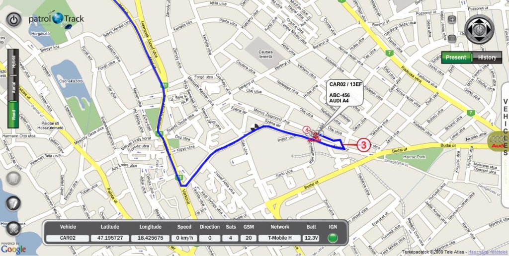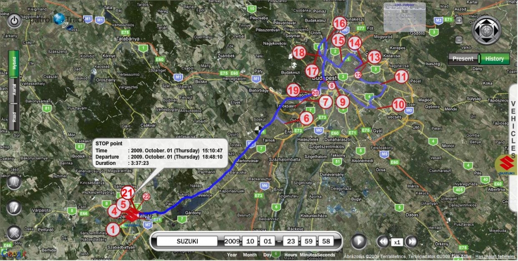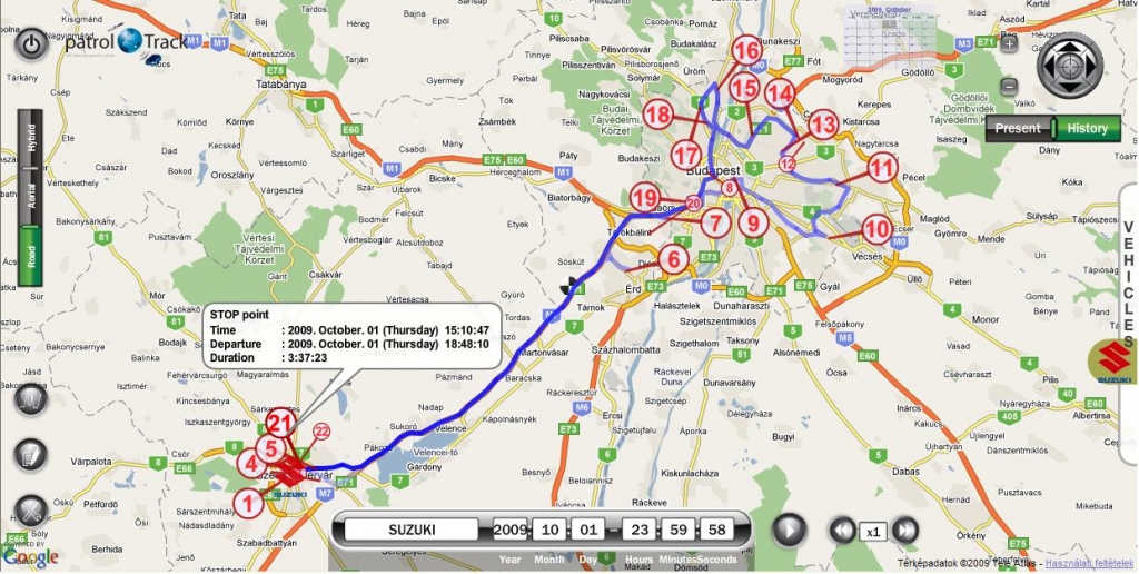 The patrolTrack server stores the data of your vehicle or fleet, therefore it is possible to represent the routes of the vehicles on the map retroactively too with the selection of the given day, signing the stopping points.