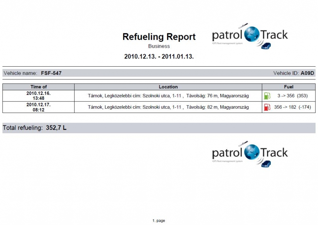 Based on the data above, the list that can be made with only one click, can be compared with the fill-up certificate issued by the petrol station. Comparing the two documents, perfect control can be received about the fuel account of the vehicle.