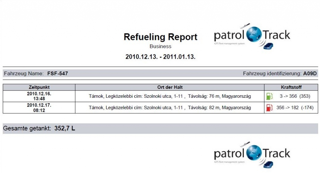 Das PatrolTrack System kann eine Tankenliste über die aktuelle Periode machen, darauf die folgende Daten definiert werden: